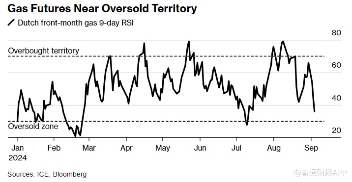 智通财经APP获悉,随着对近期供应的担忧有所缓解,欧洲天然气价格在连续三天下跌后徘徊在超卖区域附近。欧洲天然气基准期货周四出现波动,本周早些时候跌幅超过10%,跌至一个月低点。9天相对强弱指数早盘跌至36以下,为7月以来最低水平。