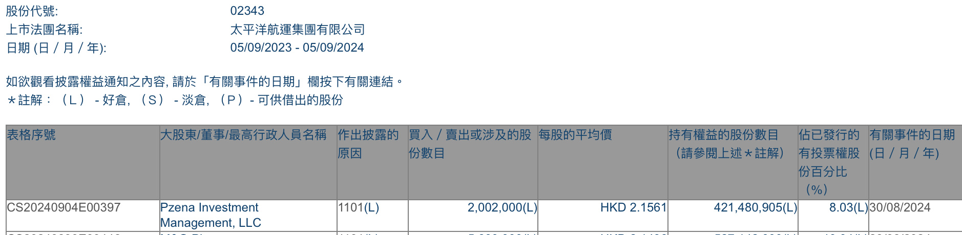 智通财经APP获悉,香港联交所最新资料显示,8月30日,Pzena Investment Management,LLC增持太平洋航运(02343)200.2万股,每股作价2.1561港元,总金额约431.65万港元。增持后最新持股数目约4.21亿股,最新持股比例为8.03%。