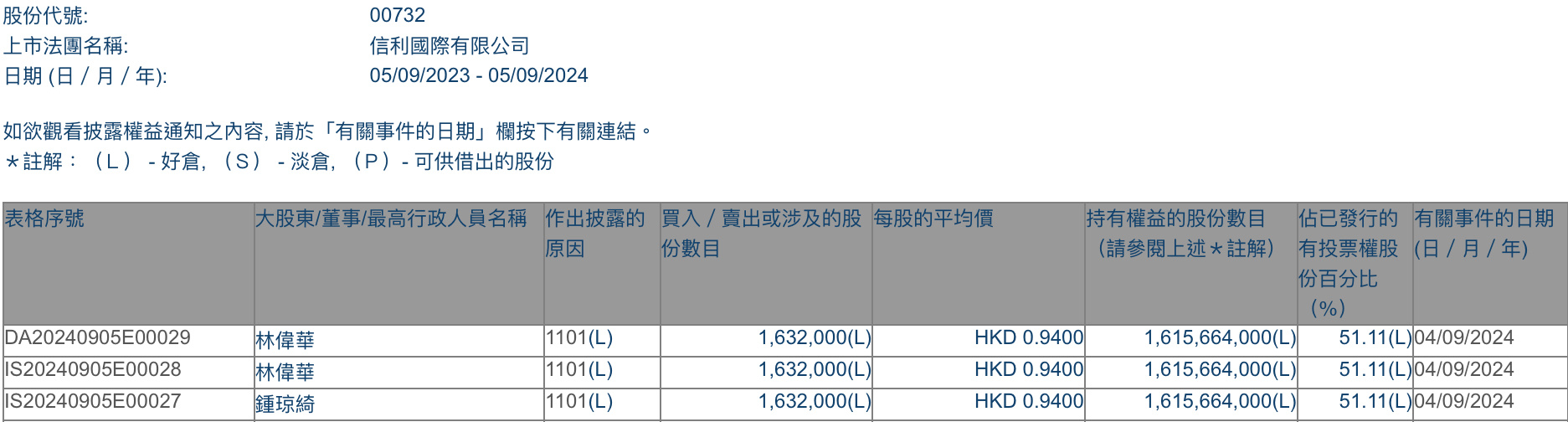 智通财经APP获悉,香港联交所最新资料显示,9月4日,集团主席兼执行董事林伟华增持信利国际(00732)163.2万股,每股作价0.94港元,总金额为153.408万港元。增持后最新持股数目约为16.16亿股,最新持股比例为51.11%。