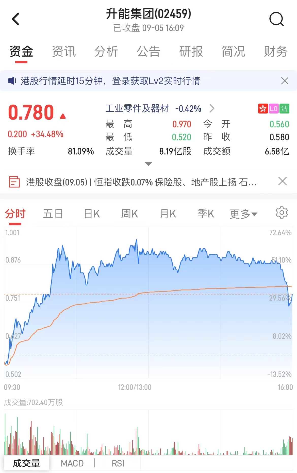 智通财经APP注意到,本周二因闪崩而抢占C位的升能集团(02459),今日延续了上一个交易日的强势反弹行情。早盘,升能集团低开后快速拉升,盘中最大涨幅一度接近70%。截至收盘,该股上涨34.48%至0.78港元,涨幅已较盘中高位大幅回落,但依然居于涨幅榜前列。而在前一个交易日,升能集团的收盘涨幅则为78.46%。