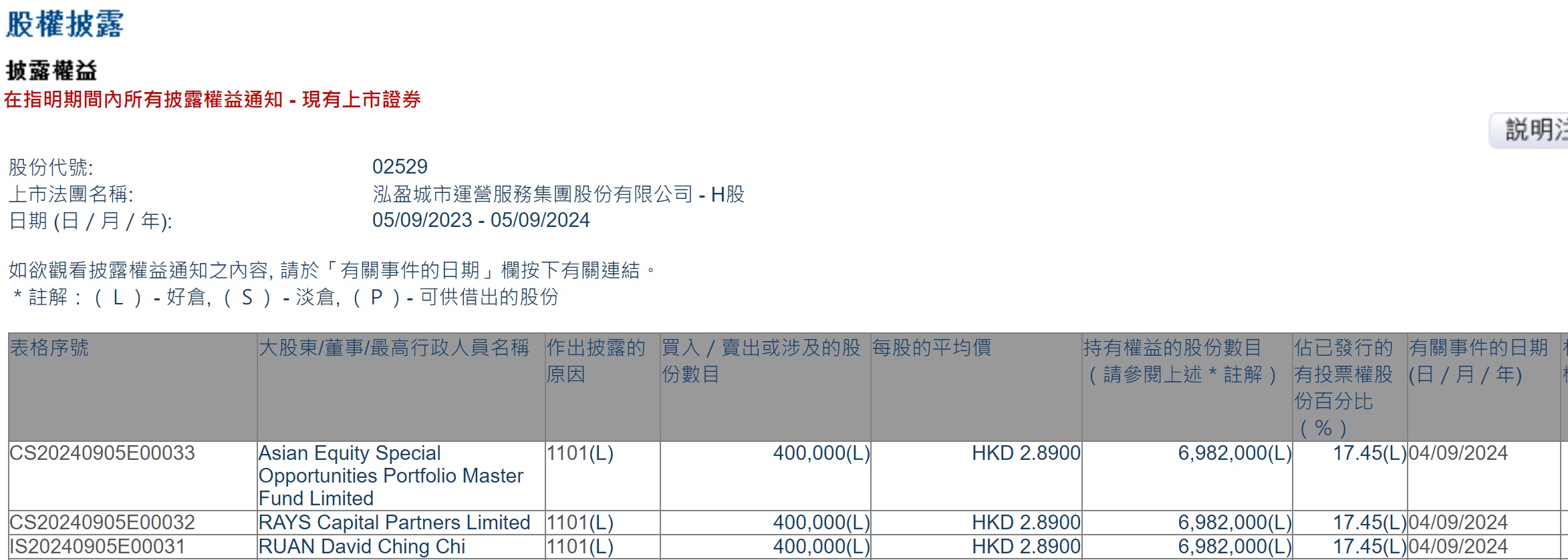Limited增持泓盈城市服务(02529)40万股,每股作价2.89港元,总金额115.6万港元。增持后最新持股数目为698.2万股,最新持股比例为17.45%。