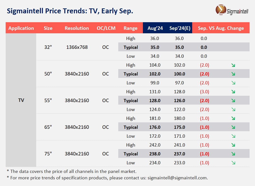 55",需求未见恢复,面板厂策略分化,8月面板均价下降4美金,预计9月均价下降2美金。