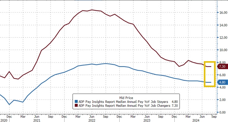 尽管如此,就业增长疲软(对鸽派来说是个好消息),但工资增长下降趋势已停止,这是反通胀的趋势停滞(这不是一个好现象)。ADP首席经济学家Nela Richardson表示:“在经历了两年的大幅增长后,就业市场的下行趋势使招聘速度低于正常水平。下一个值得关注的指标是工资增长,在疫情后大幅放缓后,工资增长正在企稳。”