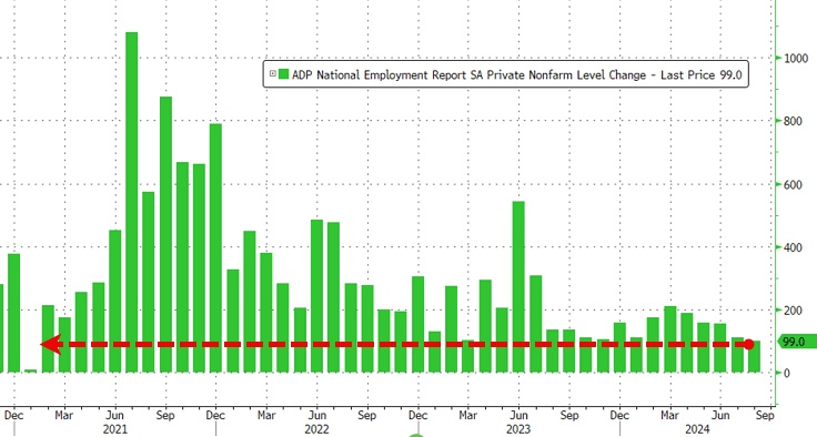 智通财经获悉,美国“小非农”8月ADP就业人数 9.9万人,预期14.5万人,创2021年1月以来最小增幅,前值由12.2万人修正为11.1万人。美国企业上个月增加的就业岗位是自2021年初以来最少的,这进一步表明劳动力市场正在进入放缓阶段。