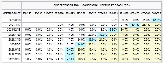 ADP和初请数据公布后,美联储9月降息25个基点的概率微降。据CME“美联储观察”:美联储9月降息25个基点的概率为55.0%(公布前为57.0%),降息50个基点的概率为45.0%(公布前为43.0%)。美联储到11月累计降息50个基点的概率为28.9%,累计降息75个基点的概率为49.7%,累计降息100个基点的概率为21.3%。