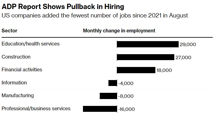 ADP报告显示,专业/商业服务、制造业和信息行业的就业人数下降。8月份就业增长的一半以上来自建筑、教育和卫生服务部门。员工人数在500人以上的公司增加的就业岗位数量是今年年初以来最少的。
