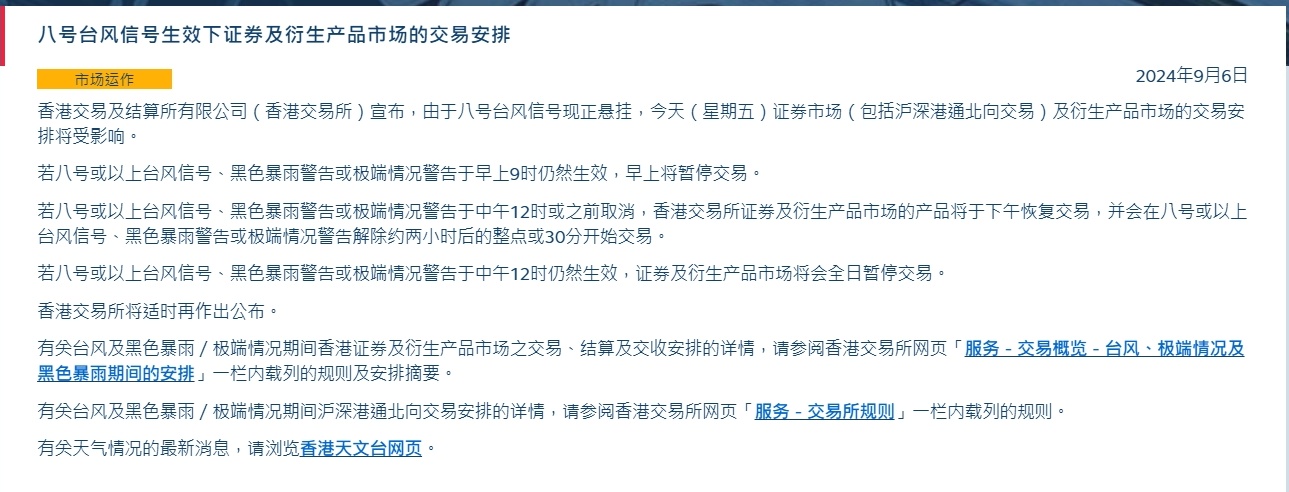 智通财经APP获悉,9月6日,香港交易及结算所有限公司(香港交易所)宣布,八号或以上台风信号、黑色暴雨警告或极端情况警告于早上9时仍然生效,早上将暂停交易。由于黑色暴雨警告仍然持续及香港政府宣布极端情况生效,证券(包括沪深股通)及衍生产品市场早上交易时段已取消。