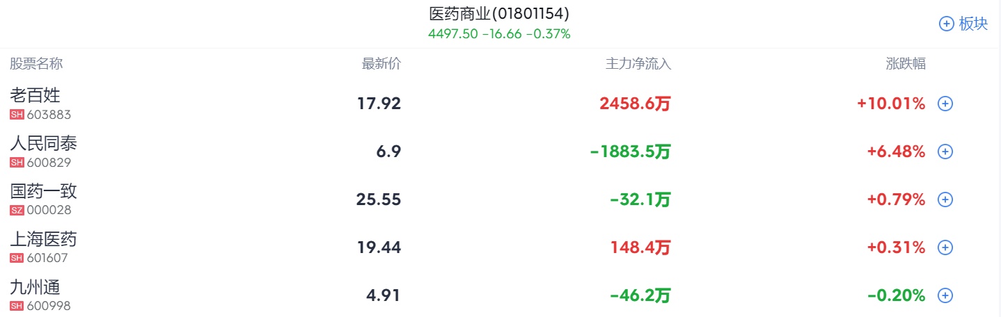 医药商业概念持续活跃,老百姓6天5板,人民同泰、漱玉平民、健之佳、国科恒泰等跟涨。