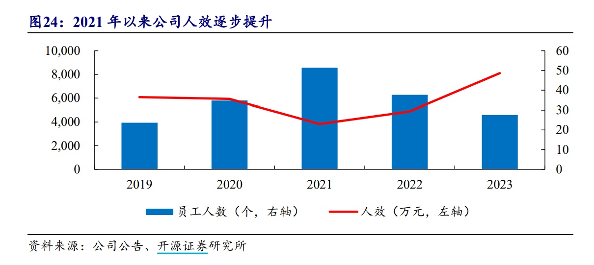 业务结构调整之外,微盟持续提升人效和优化组织结构,使费用支出得到了有效控制。事实上,造成微盟自2021年以来经调整净利润持续亏损的关键原因便是人效的降低以及渠道建设增加了费用支出。2021年起,微盟为研发WOS招聘大量技术人员,人效有所下滑,2022年WOS顺利发布后,2023年人员压力逐步释放,在趋于稳定后人效逐步回升。