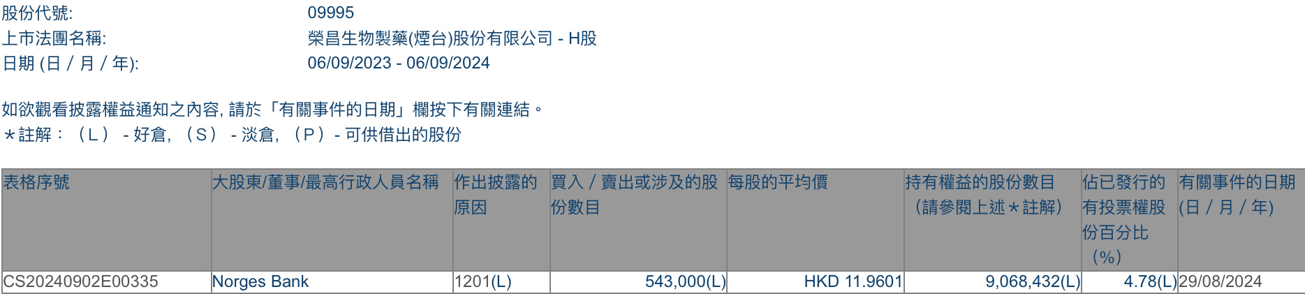 智通财经APP获悉,香港联交所最新资料显示,8月29日,Norges Bank减持荣昌生物(09995)54.3万股,每股作价11.9601港元,总金额约649.43万港元。减持后最新持股数目约为906.84万股,持股比例为4.78%。
