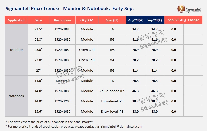 23.8"FHD,9月 Open cell面板价格和LCM价格预计持平;