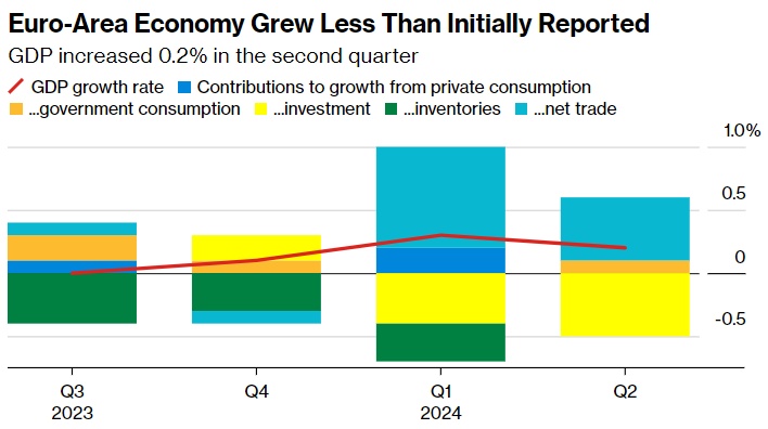 智通财经获悉,欧元区经济增长势头在第二季度放缓。欧元区第二季度季调后GDP季率终值下修至0.2%,低于欧盟统计局最初公布的0.3%,低于预期的0.3%。欧盟统计局表示,尽管贸易和政府支出支撑了经济增长,但投资仍是拖累因素。