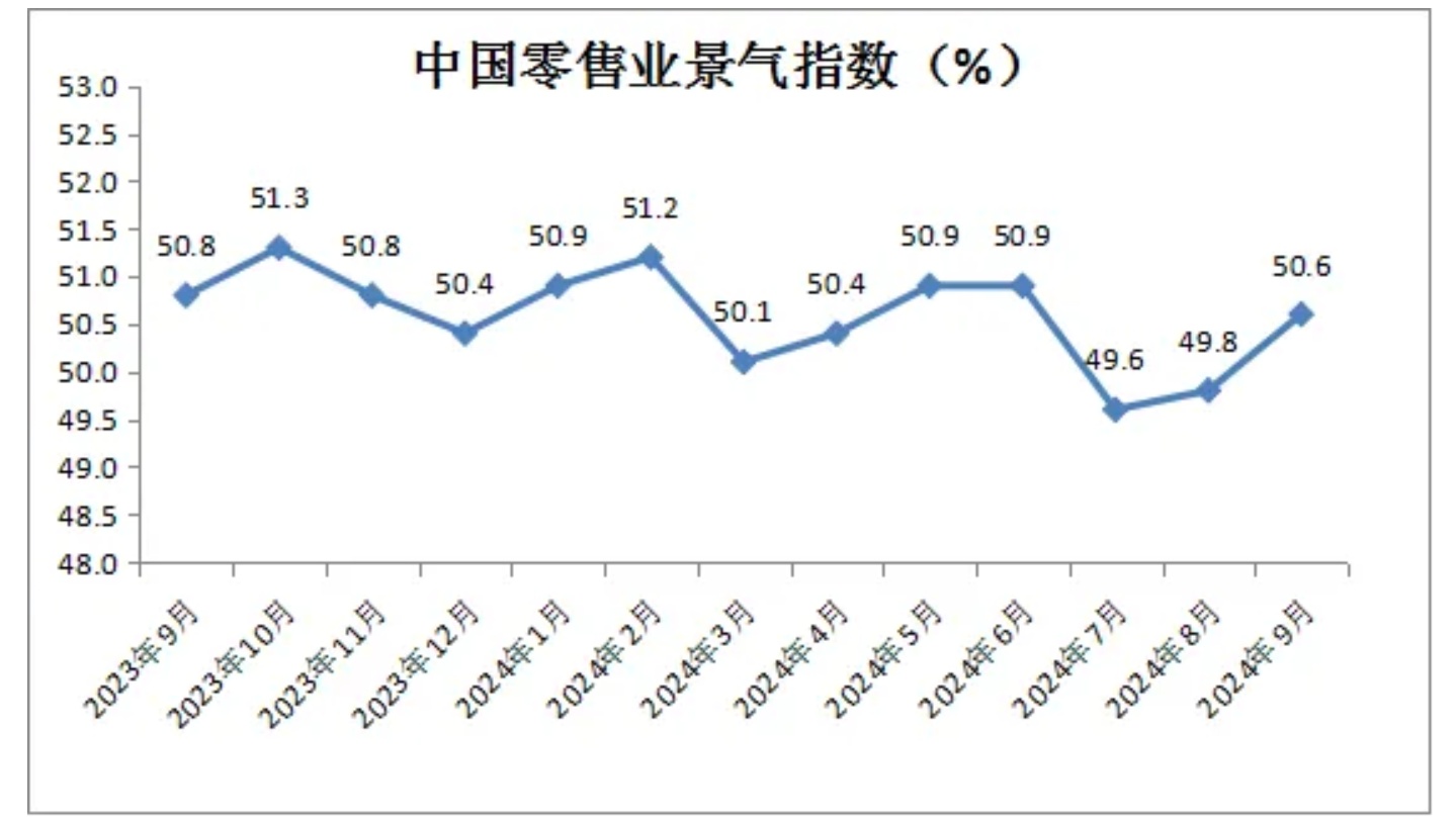 智通财经APP获悉,9月6日,中国商业联合会发布9月份中国零售业景气指数(CRPI)。9月份,中国零售业景气指数(CRPI)为50.6%,较上月上升0.8个百分点。数据显示,9月份构成综合指数的三大分类指数均进入扩张区间。其中,商品经营类指数较上月上升1.1个百分点,租赁经营类指数虽然小幅下降0.5个百分点,依然连续12个月持续在扩张区间运行;电商经营类指数较上月上升0.9个百分点。分析认为,中秋国庆双节临近,零售业预计将迎来“金九银十”季节性消费旺季。加之消费品以旧换新政策加快落地见效,商品经营类企业和电商经营类企业均出现较明显的正向增长预期。