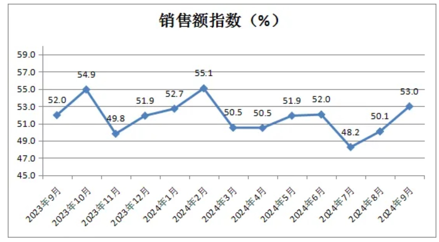销售额指数为53.0%,较上月上升2.9个百分点。分析认为,随着暑期结束,中秋国庆双节临近,商品经营类企业对9月消费旺季的销售表现预期继续升高。