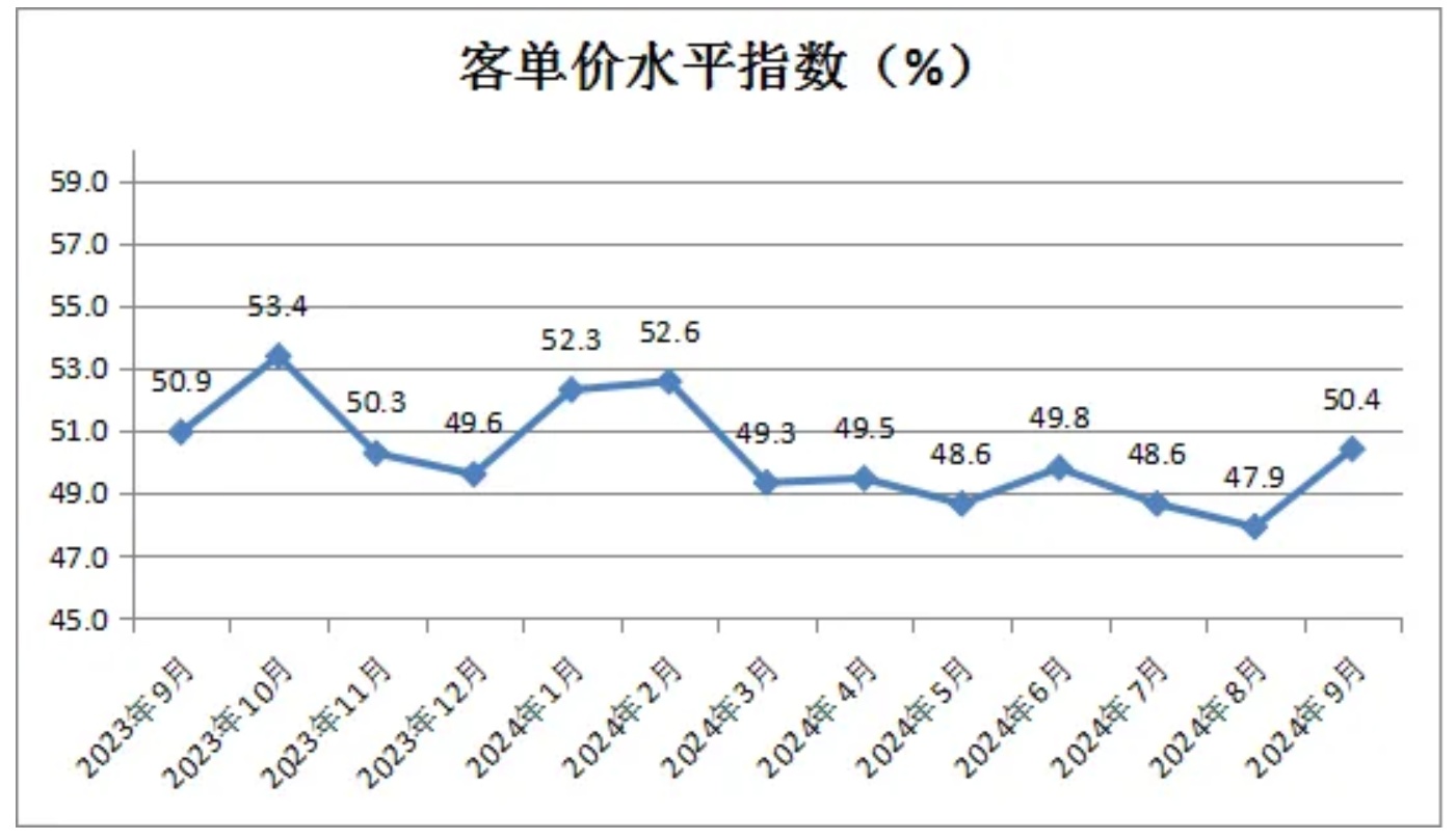 客单价水平指数为50.4%,较上月回升2.5个百分点,时隔半年重回扩张区间。分析认为,近期高温多雨天气导致果蔬等商品涨价,9月份家电等大宗商品以旧换新政策落地实施以及家庭节日消费是客单价水平提高的主要原因。