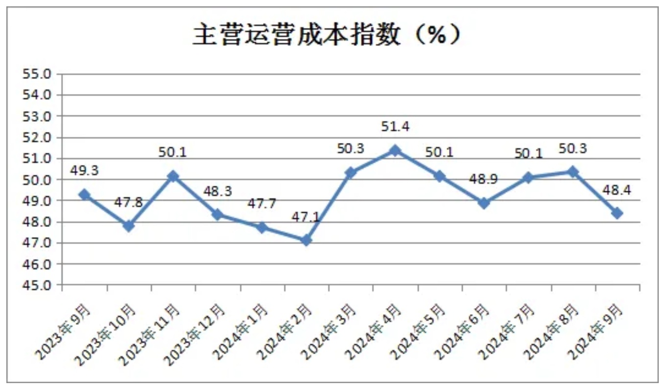 主营业务运营成本反向指数为48.4%,较上月下降1.9个百分点,表明商品经营类企业节日促销、商品展陈以及人员节假日加班,致使主营运营成本有所增加。