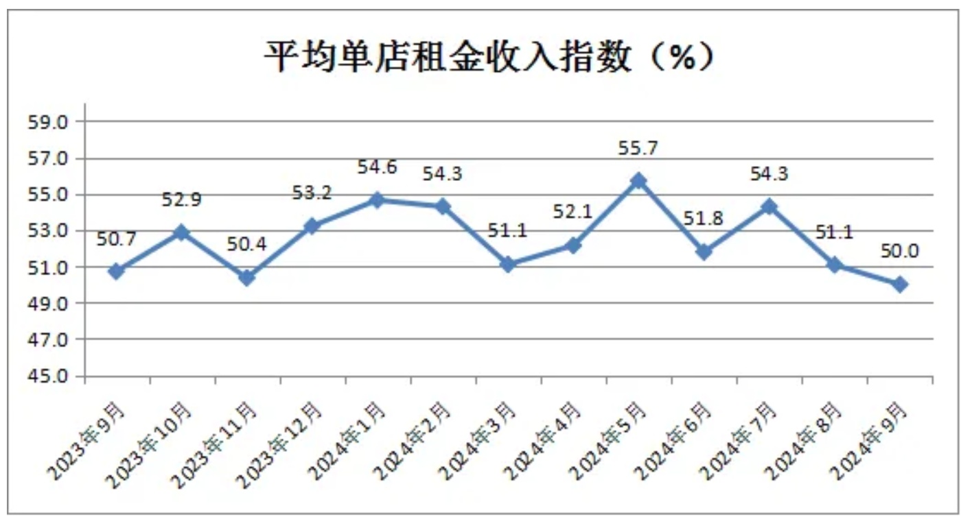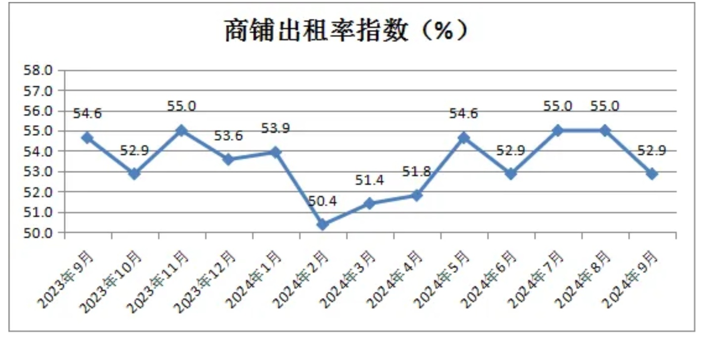 商铺出租率指数为52.9%,较上月下降2.1个百分点,表明租赁经营类企业对9月份的招商经营预期较为谨慎。