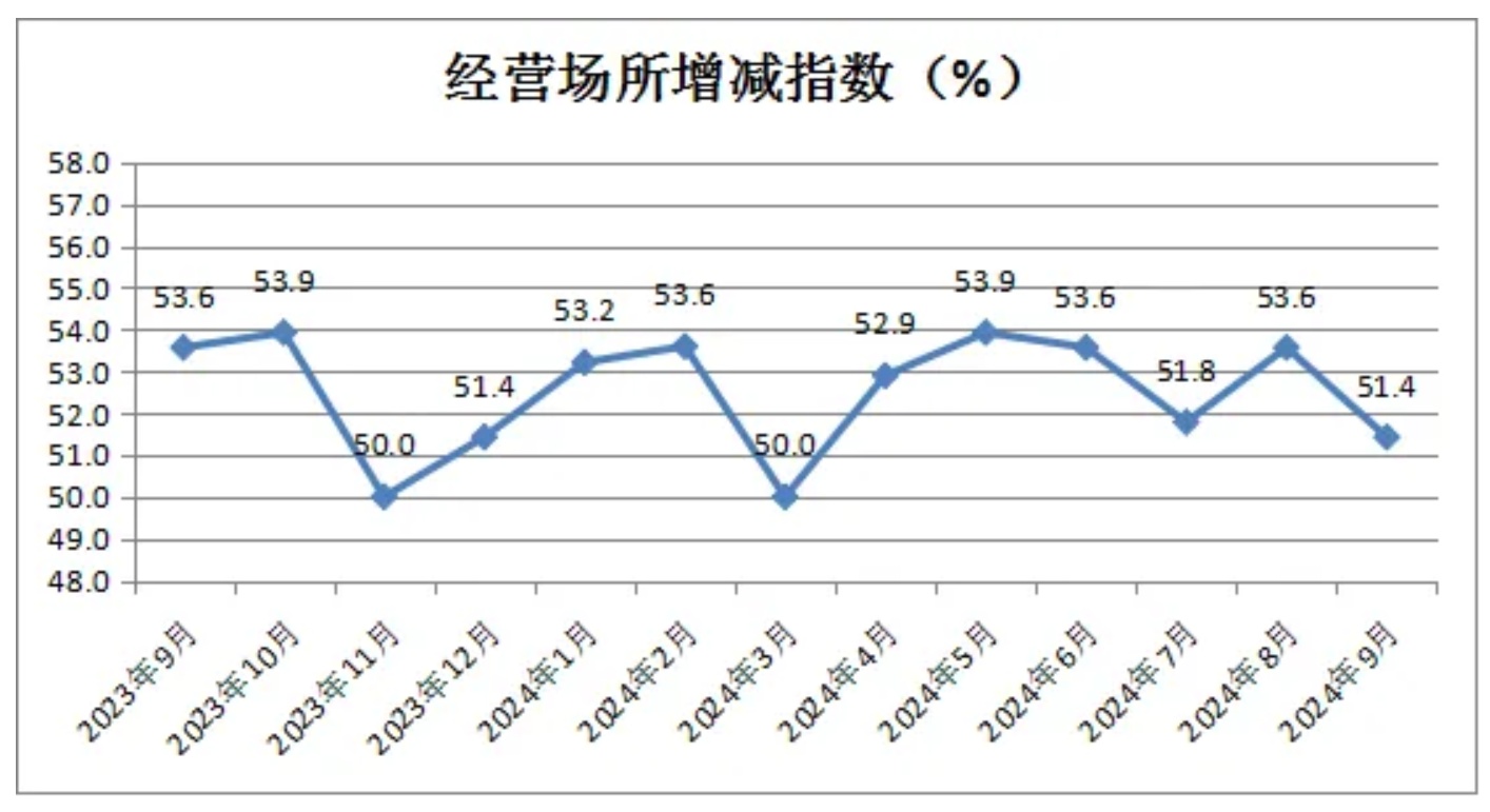 经营场所增减指数为51.4%,较上月下降2.2个百分点,表明租赁经营类企业开新店速度放缓。