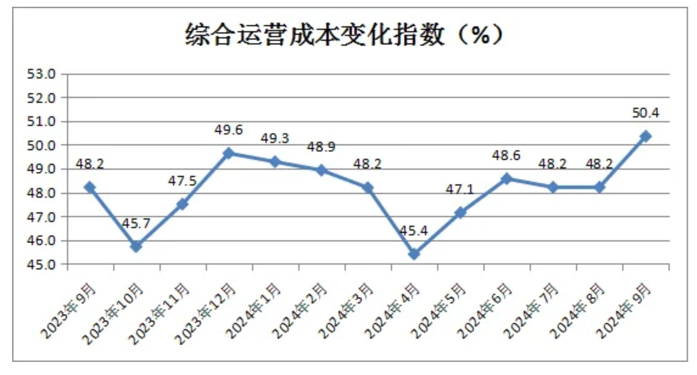 综合运营成本反向指数为50.4%,较上月上升2.2个百分点,创12个月新高,升至扩张区间。分析认为,9月份随着高温天气逐渐减少,中央空调能耗将显著下降是是租赁经营类企业综合运营成本下降的重要原因之一。