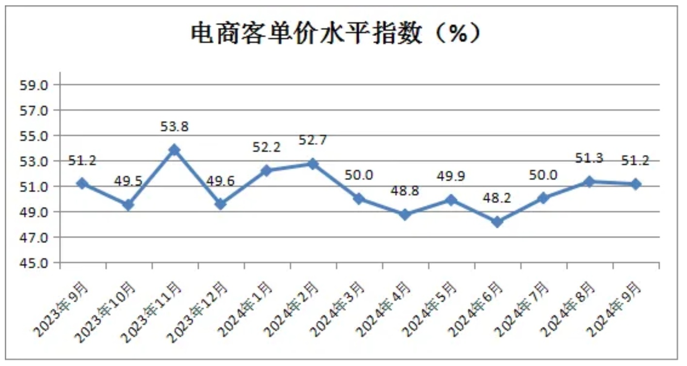 电商客单价水平指数为51.2%,较上月微降0.1个百分点。分析认为,以旧换新政策引导线上平台提振耐用品消费是9月电商客单价水平维持高位的重要原因之一。