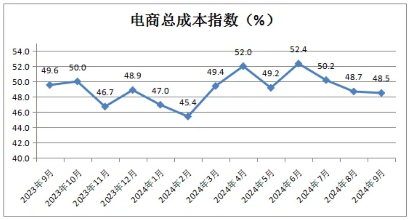 电商总成本反向指数为48.5%,较上月微降0.2个百分点,连续三个月下降,表明电商经营类企业成本持续增加,按月成本增幅逐渐收窄。