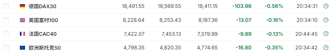 2. 截至发稿,德国DAX指数跌0.56%,英国富时100指数跌0.16%,法国CAC40指数跌0.13%,欧洲斯托克50指数跌0.35%。