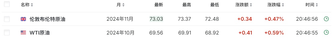 3. 截至发稿,WTI原油涨0.59%,报69.56美元/桶。布伦特原油涨0.47%,报73.03美元/桶。