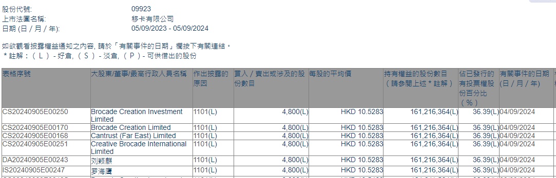 智通财经APP获悉,香港联交所最新资料显示,9月4日,Brocade Creation Investment