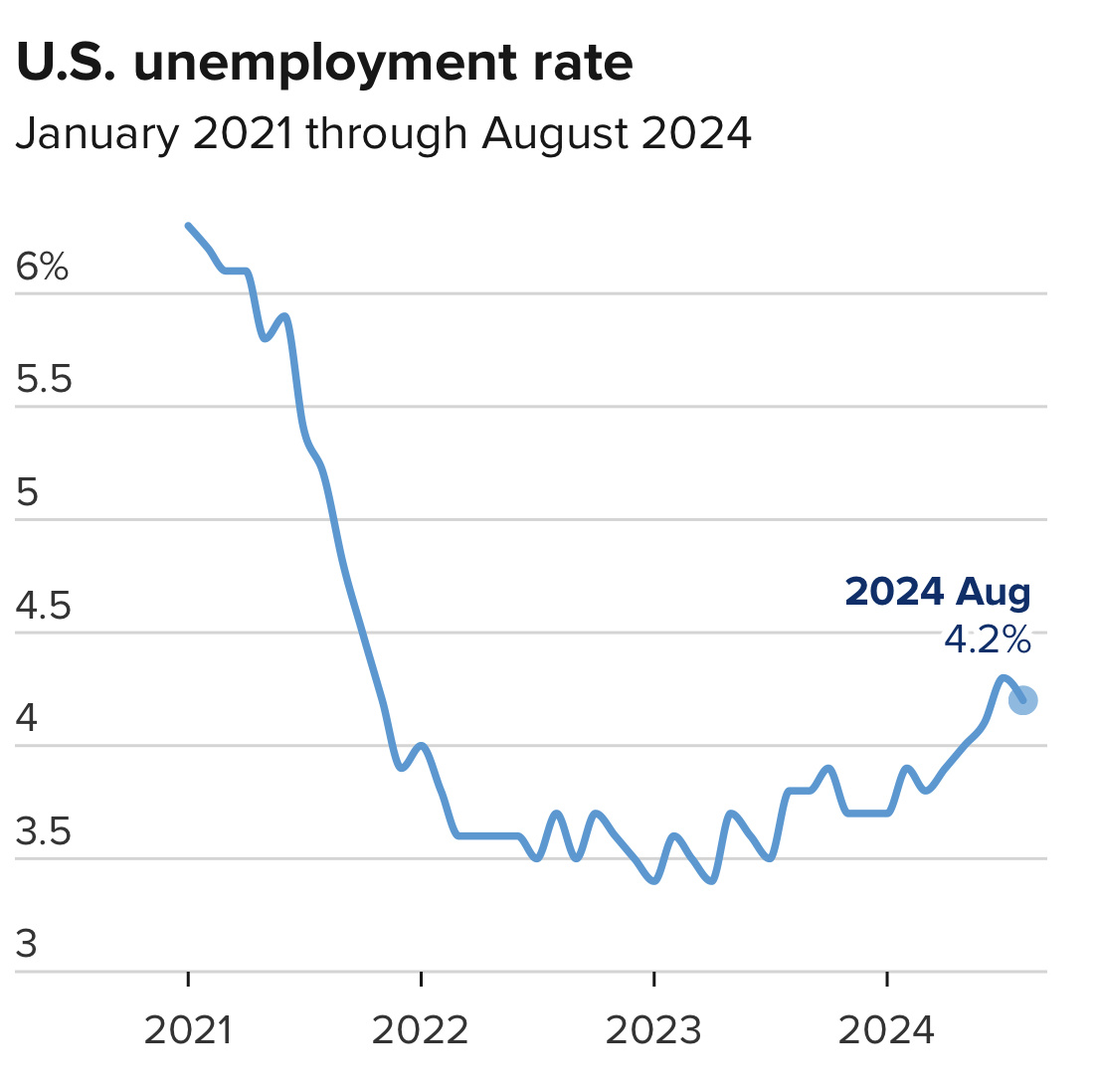 智通财经获悉,美国8月非农新增就业不及预期,市场加大对9月降息50个基点押注。美国8月季调后非农就业人口14.2万人,预期16万人。与此同时,前值由11.4万人修正为8.9万人,6月份非农新增就业人数从17.9万人修正至11.8万人;修正后,6月和7月新增就业人数合计较修正前低8.6万人。美国8月失业率录得4.2%,符合市场预期,创今年6月来新低,为连续四个月上升以来首次下降。