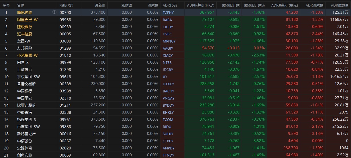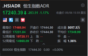 智通财经APP获悉,周五美股三大指数齐跌,恒生指数ADR下跌,按比例计算,收报17240.39点,较香港收市下跌203.91点或1.17%。