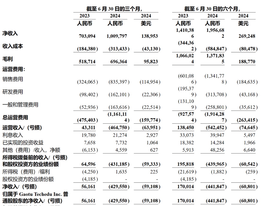 智通财经APP了解到,8月27日美股盘前,高途发布2024财年第二季度业绩。财报显示,高途Q2收入为10.10亿元(人民币,单位下同),同比增加43.6%;然而高途当期增收不增利,当期净亏损达到4.30亿元,相较去年同期的净利润5616万元,出现转盈为亏。