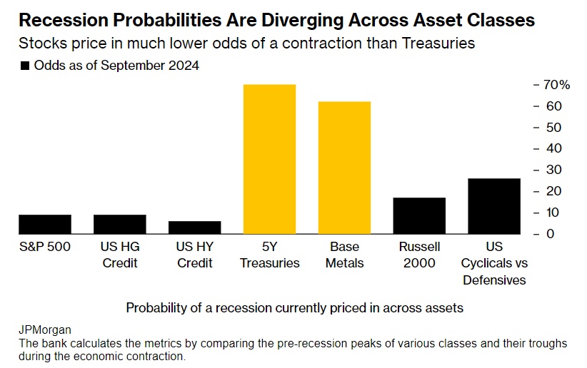 从某种角度来看,股票等风险资产的同步抛售证实了政府债券中尤为明显的谨慎态度。要了解股票和信贷在乐观增长情景下的定价与其他资产有何不同,可以参考包括尼古拉斯·帕尼吉左格鲁在内的摩根大通公司策略师所编制的模型。它通过比较各种资产与过去周期的走势,从各种大类资产走势与定价中得出经济衰退的可能性。模型显示,截至周三,股市和投资级信贷所暗示的经济衰退可能性相对最低,仅为9%。