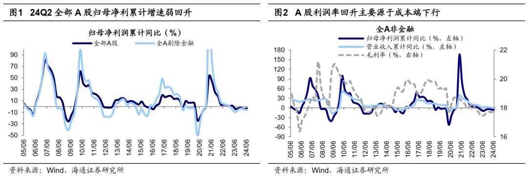 整体上看,24Q2全部A股盈利在低基数下实现弱回升。从累计同比角度看,24Q2全部A股归母净利累计同比增速在低基数下小幅回升至-3.2%,24Q1为-4.8%。剔除金融后,24Q2全部A股归母净利累计增速为-6.0%,24Q1为-5.5%。从单季同比角度看,全部A股同比增速改善更为明显,24Q2全A归母净利单季同比增速回升至-1.4%,24Q1为-4.8%,剔除金融后为-6.4%、-5.7%。
