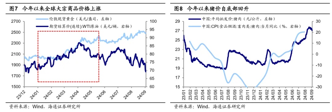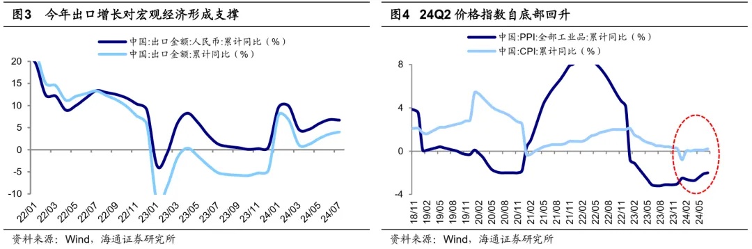 24Q2企业盈利小幅回升反映出当前宏观经济处在修复之中。今年上半年我国宏观经济实现温和修复,24年上半年GDP实际同比增速为5%,其中Q1为5.3%、Q2为4.7%,Q2增速相较于Q1有所放缓,短期宏观经济修复面临一定压力。但我们也能看到经济整体表现仍有亮点:从出口看,今年1-7月人民币计价下我国出口累计同比增速达到6.7%,明显高于2023全年的0.6%,外需对宏观经济的支撑仍较强;从物价看,7月CPI当月同比为0.5%,为今年2月以来的新高,7月PPI当月同比为-0.8%,延续自今年4月以来自底部回升的态势,价格对实际增长的拖累或在减弱。