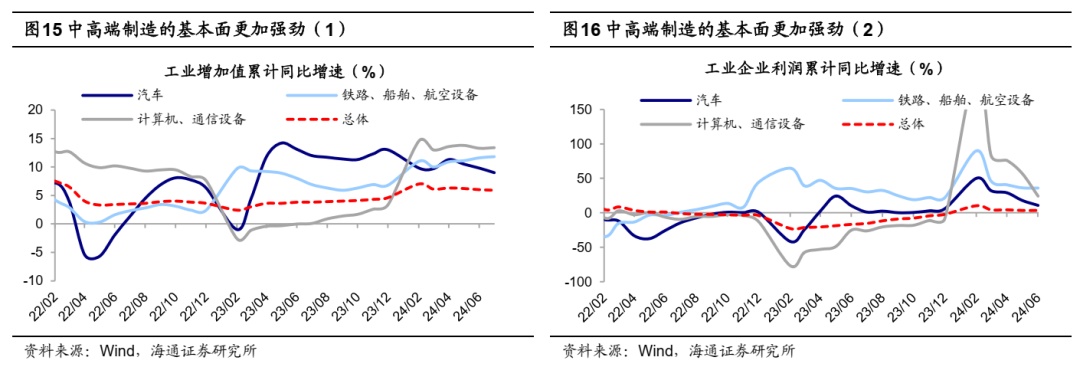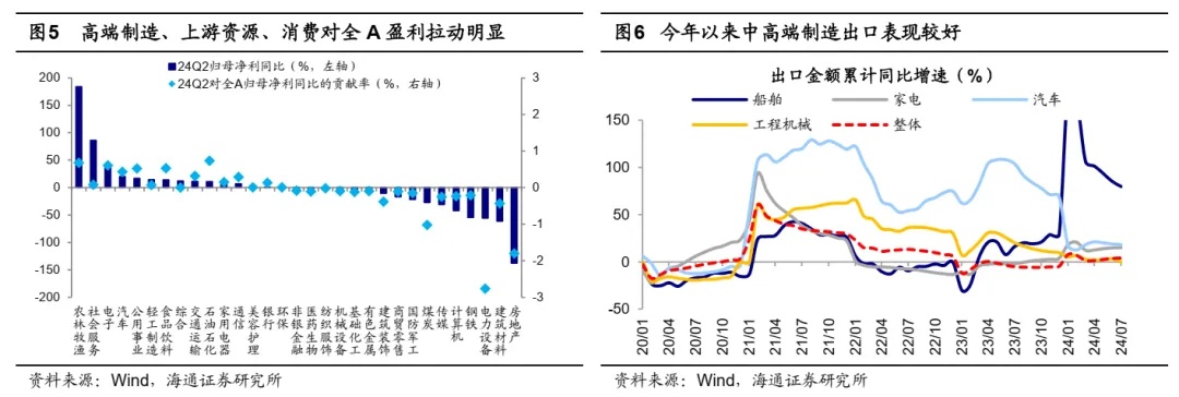 一是高端制造板块在内外共振下盈利表现较好。高端制造板块中以电子为代表的科技制造和中高端制造对全A盈利拉动较大。科技制造方面,受益于全球半导体周期回升和AI技术推动终端创新,电子板块24Q2/Q1归母净利累计同比增速为39.1%/54.4%,24Q2贡献了全A归母净利润增速的0.6个百分点;中高端制造方面,今年以来相关板块景气度较高,外需支撑下今年1-7月我国汽车(累计出口金额增速为18%,下同)、家电(15%)等中高端制造出口较强,叠加近期消费品以旧换新和大规模设备更新等扩内需政策加速落地,在内外需共振下汽车、家电等中高端制造板块盈利保持较快增长,汽车24Q2/Q1归母净利润累计同比分别为22.2%/18.5%,家电为7.8%/10.0%,24Q2汽车和家电分别贡献了全A盈利增长的0.4个百分点、0.2个百分点。