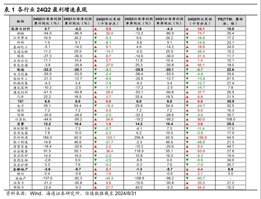 三是消费板块受猪肉猪价、服务消费改善利好盈利得到提振。消费板块整体盈利实现了稳健增长,24Q2/Q1归母净利同比增速为12.2%/10.4%,其中,农林牧渔、社会服务对盈利回升贡献较大。具体而言,农林牧渔方面,板块主要受益于猪价回升,今年上半年猪肉平均批发价格上涨18%,推动农林牧渔板块24Q2/Q1归母净利同比增速为184.0%/60.9%,24Q2贡献了全A盈利增长的0.7个百分点。社服板块方面,今年1-7月社会消费品零售中餐饮收入累计同比为7.1%,高于整体增速的3.5%,服务消费复苏更快推动社服板块盈利改善,24Q2/Q1社会服务归母净利累计同比增速为91.5%/55.1%,24Q2贡献了全A盈利增长的0.1个百分点。