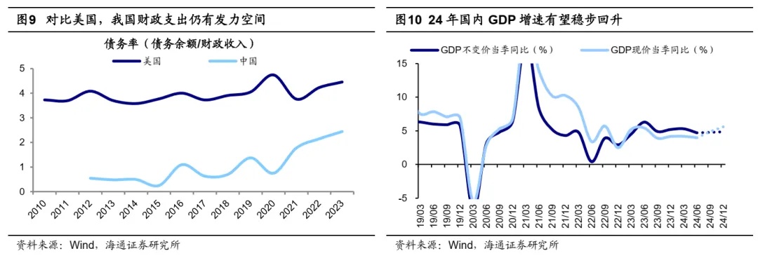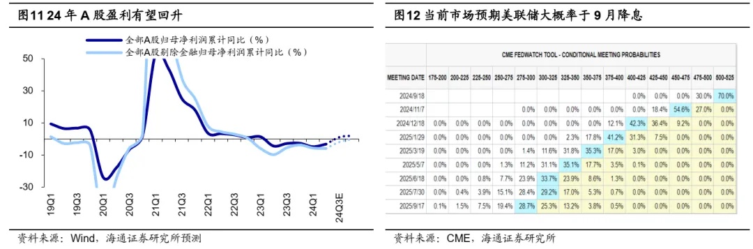 往后看,我们认为或还存在着三大希望推动基本面和预期回暖:一是财政有望发力提振内需,当前我国财政支出仍有发力空间,730政治局会议提出“及早储备并适时推出一批增量政策举措”,未来外围因素变化或为我国财政发力提供契机;二是我国中高端制造在供需优势支撑下,有望为外循环带来新增长点;三是改革有望提振预期释放红利,当前我国经济和股市信心不足,经济体制改革和资本市场改革推进值得期待。随着近期稳增长政策落地叠加未来以上三大因素出现积极变化,后续我国宏观基本面有望企稳,结合海通宏观预测,24年国内实际GDP同比增速有望达5%,落实到微观层面,我们预计24年全A归母净利润同比增速有望达到2%。