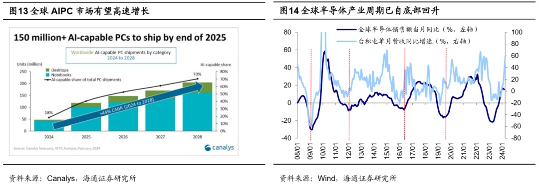 科技制造方面,在政策利好和技术创新双重驱动下,未来科技制造相关领域有望进一步受益,具体细分领域中可关注以下领域:一是AI技术赋能推动消费电子复苏。AI技术的应用正不断催生AI手机、AI PC等终端的创新,消费电子行业的复苏趋势逐渐明显,苹果宣称将于美西时间9月9日发布第一款AI手机,或有望提振全球手机销量,IDC预计24年中国AI手机出货量为0.4亿台,27年将上升至1.5亿台、渗透率超过50%。二是AI浪潮带动半导体周期回升。AI技术的性能推进对关键半导体元件的需求具备促进作用,目前来看全球半导体周期已处在明显回升趋势中。三是财政发力背景下的数字基建相关领域。近期全国各大城市“车路云一体化”示范项目已启动,政策利好下相关路侧基建建设有望提速。根据前瞻产业研究院的预测,2028年我国车路协同行业市场将达到2448亿美元,23-28年复合增长率为13%。