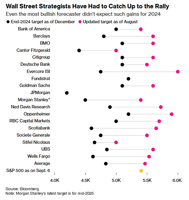 即使在经历了8月的波折之后,标普500指数今年迄今仍上涨了13%,MSCI全球指数则上涨了10%。而由于今年强劲的开局,瑞银、RBC Capital等机构的策略师在几周之前争相上调了对标普500指数的年终目标。