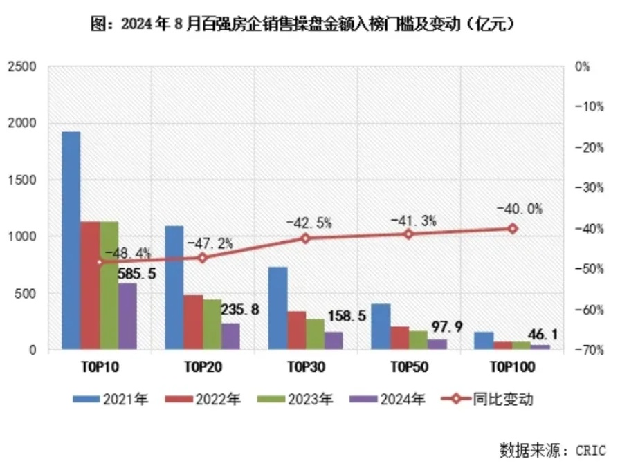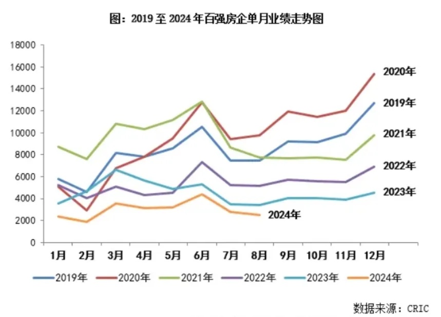 报告显示,2024年以来百强房企单月业绩走势均处于近六年来最低。