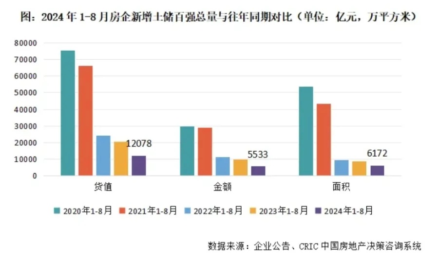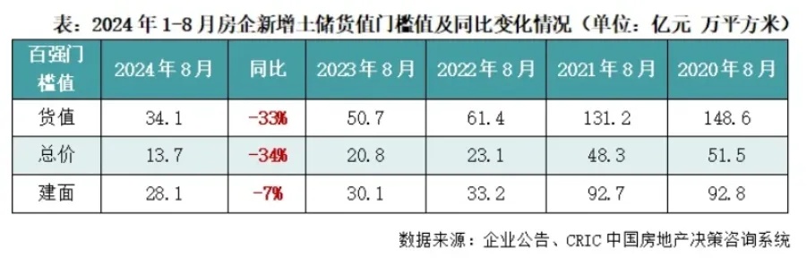 总量方面,1-8月新增货值、总价和建面百强的总额分别为12078亿元、5533亿元和6172万平方米,同比分别下降40%、42%和28%。与门槛降幅收窄不同的是,百强新增土储总量同比降幅仍在扩大。