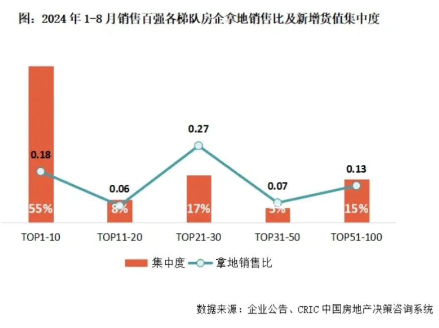 1-8月拿地金额超过百亿的企业增至仅有13家,比去年同期减少6家,企业投资力度断层、分化现象持续。