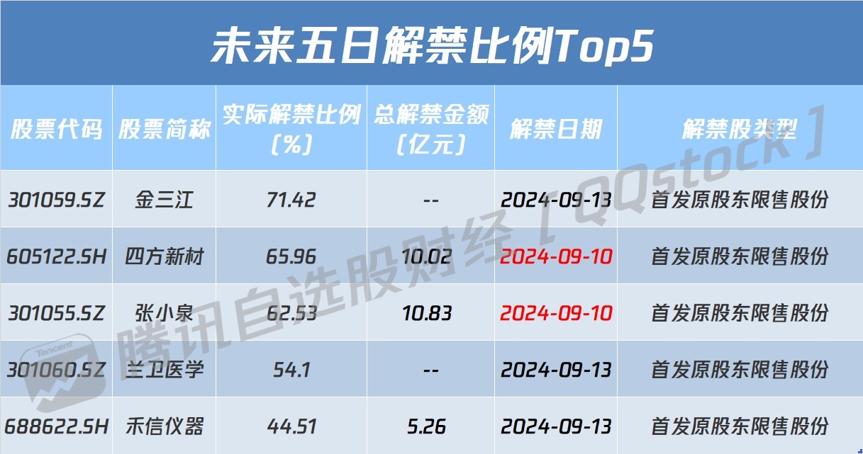 从解禁比例来看,未来五日金三江实际解禁比例达71.42%,其次解禁比例居前的分别为四方新材和张小泉。