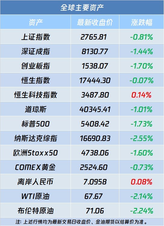 自选哥提示:上周五美股重挫!纳指大跌2.5%,特斯拉暴跌超8%。其他市场方面,COMEX黄金期货主力合约下跌18.5美元/盎司,跌幅0.73%,报2524.60美元/盎司;纽约商品交易所10月交货的轻质原油期货收于每桶67.67美元,跌幅为2.14%;11月交货的伦敦布伦特原油期货收于每桶71.06美元,跌幅为2.24%。