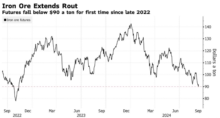上周五美国非农数据逊于预期引发美股大跌,日元兑美元大涨,周一,日本股市跟跌,日经225指数开盘下跌3%。与此同时,周一公布的数据显示,日本第二季度季调后实际GDP季率修正值为0.7%,低于预期的0.8%;年化季率下修至2.9%,预期3.2%。在此背景下,铁矿石价格周一跌至22个月低点,跌破每吨90美元的关口。