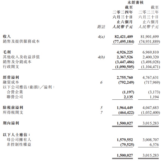 最新披露的中期财报显示,2024年上半年,公司营业收入约为824.21亿元人民币,同比增加0.63%;股东应占溢利15.8亿元,同比减少47.5%。毛利为49.26亿元,较去年同期减少29.3%,毛利率为6.0%,较去年同期略有下降。