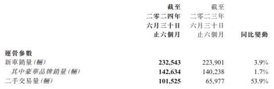 截至目前,新车销售仍是公司的营收支柱,截至2024年6月30日止六个月,该业务收入占总收入的73.8%(2023年同期卫78.8%)。
