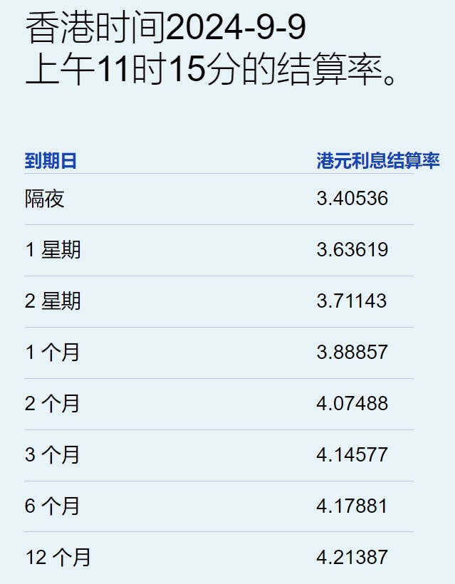 智通财经APP获悉,9月9日,港元拆息普遍向下,其中,隔夜息跌7.535基点至3.40536%,为9月3日以来最低;一周亦跌1.524基点至3.63619%;两周则升1.714%至3.71143%。与楼按相关的一个月拆息报3.88857%,升0.25基点,终止三连跌。