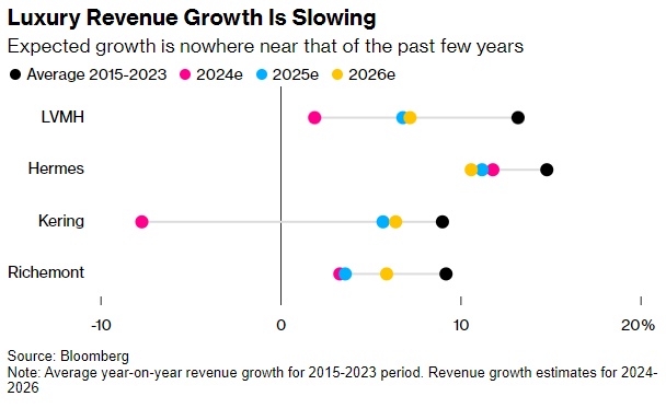 瑞银分析师Zuzanna Pusz将奢侈品行业的前景描述为“长期放缓”。Pusz调整了对2025年和2024年下半年有机销售增长的预测,并预测“在经历了几年的高价格繁荣之后,该行业似乎正在进入自己的特定周期。”