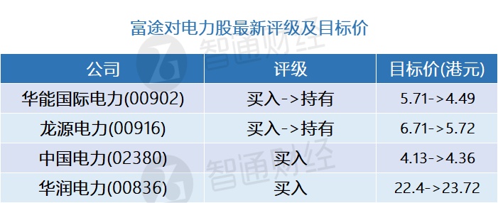该行表示,重申对中国电力(02380)“买入”评级,指公司受惠水力发电下半年改善及管理层承诺股东回报,该股连特别息有7.8厘回报。该行在民营发电厂之中偏好华润电力(00836),指公司涉及煤电且有6厘股息,与其股票质素相称。该行下调对华能国际电力(00902)投资评级至“持有”,基于派息不确定性,并关注市场主导煤电上网电价下滑及资产减值。该行还下调对龙源电力(00916)投资评级至“持有”,关注市场主导下的可再生能源上网电价下跌。